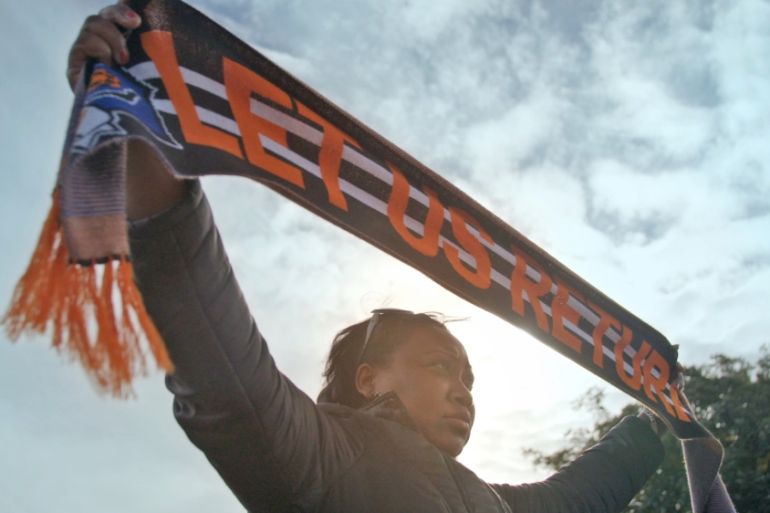 Sabrina’s advocacy takes her all over the world; in front of the White House, she lifts a banner that reads: “LET US RETURN”.
