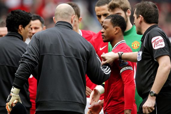 | Game, what game? All eyes were on Luis Suarez and Patrice Evra at Old Trafford [GETTY] |
