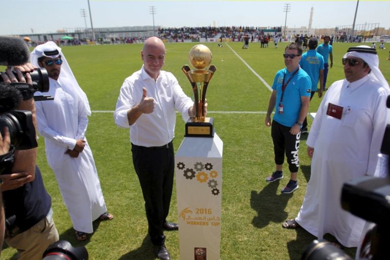 In his first trip to Qatar since becoming FIFA president in February, Infantino met the Emir, Sheikh Tamim bin Hamad Al Thani, and visited Khalifa International Stadium in Doha, which was named in an Amnesty International report as a site where workers have suffered rights abuses.