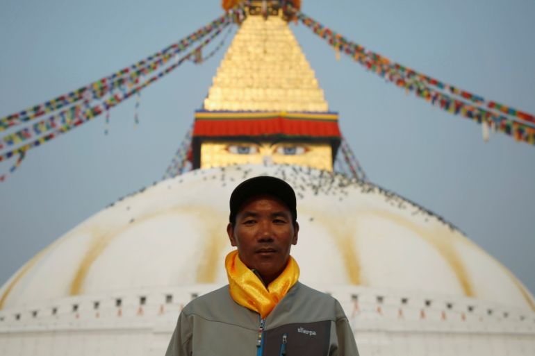 Kami Rita Sherpa, 48, who is attempting a world record by climbing Mount Everest for the 22nd time this season, poses for a picture at Boudhanath Stupa in Kathmandu