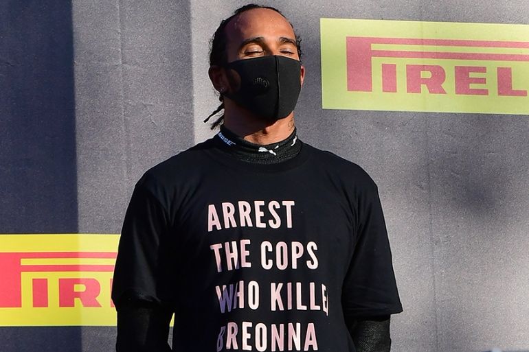 But Hamilton’s focus was elsewhere as he stood on the podium on Sunday wearing a T-shirt featuring the words: “Arrest the cops who killed Breonna Taylor.”