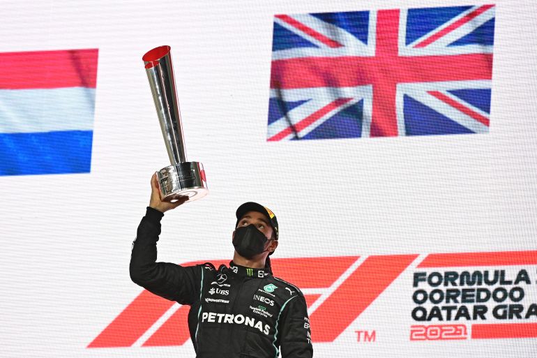 Hamilton claimed his seventh season win and 102nd overall ahead of Verstappen at the flood-lit Losail International Circuit where his Mercedes had already been superior over Verstappen’s Red Bull in qualifying.