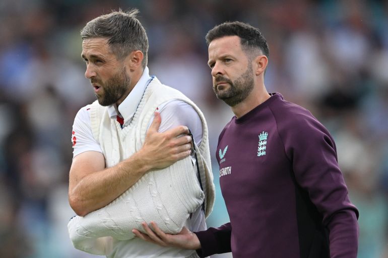 Woakes injured himself late on Thursday’s opening day in south London in a desperate bid to prevent a boundary, landing awkwardly and then leaving the field with his left arm in a makeshift sling while in evident pain.