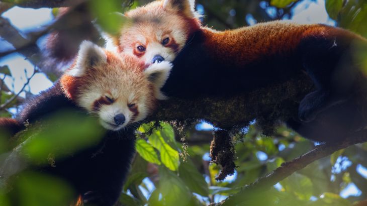 Red pandas are known for their bright red fur and bushy, ringed tails and for spending most of their time sleeping in the trees of the mountainous forest range.
