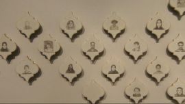 Artist Sobia Ahmad transferred ink from Muslim American immigrants’ ID photos onto ceramic tiles for her wall installation.