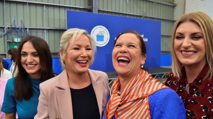 ![Sinn Fein deputy leader Michelle O'Neill (centre left), party leader Mary Louise McDonald (centre right) and party candidates Emma Sheerin (left) and Linda Dillon (right) celebrate, after Sinn Fein were voted as the largest party in Northern Ireland on May 7, 2022 [Clodagh Kilcoyne/Reuters]](https://www.aljazeera.com/wp-content/uploads/2022/05/northerireland.jpg?resize=730%2C410&quality=80)
