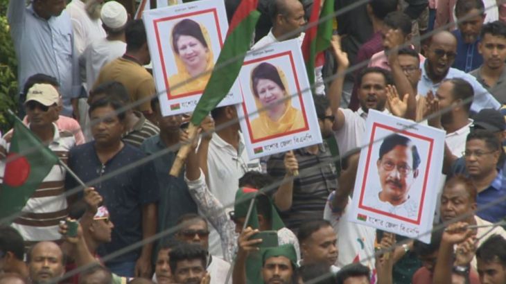 But tens of thousands of opposition supporters have joined protests in the capital Dhaka, demanding her resignation.