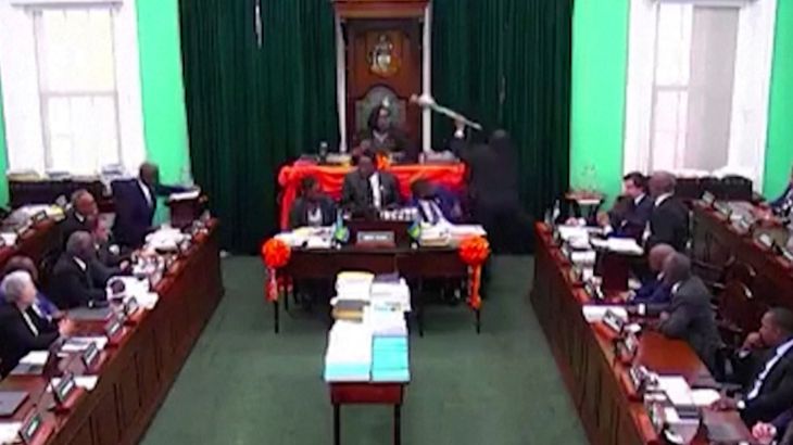 Video from the Bahamas shows an opposition MP staging a protest in parliament by grabbing the ceremonial mace and throwing it out of the window.
