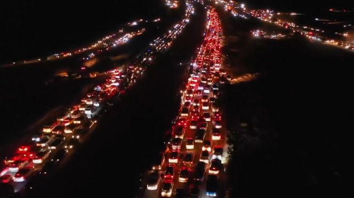 Video shows thousands of cars jamming roads to Damascus as displaced people return to the capital after hearing the Assad regime had been overthrown by the opposition.