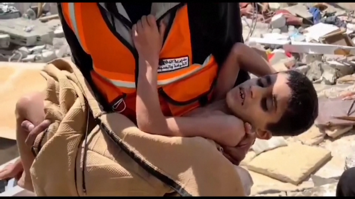 This Palestinian boy was pulled out of the rubble of his home 9 days after it was destroyed by an Israeli air attack.
