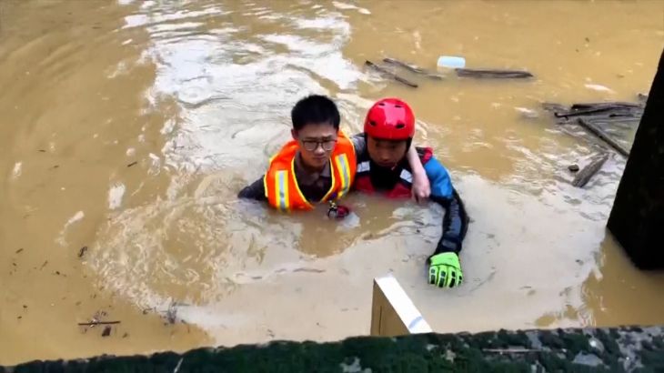 Videos show cars being washed away and communities under water after major flooding in China which has led to 100,000 people being moved out of their homes.
