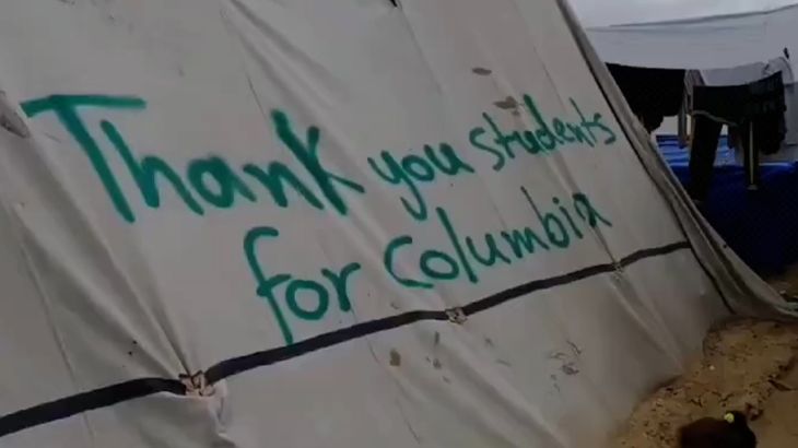 Displaced Palestinians in Gaza are expressing their thanks to student protesters on US college campuses by writing messages of gratitude on their tents in Rafah.