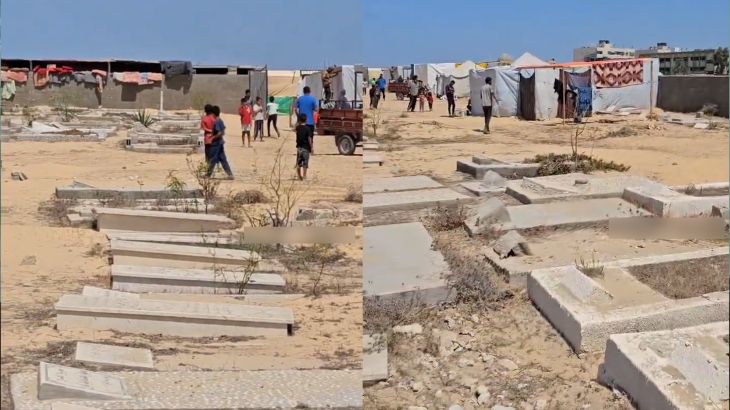 Displaced Palestinians have been forced to seek shelter in a cemetery in Gaza’s Khan Younis due to overcrowding and repeated Israeli attacks.