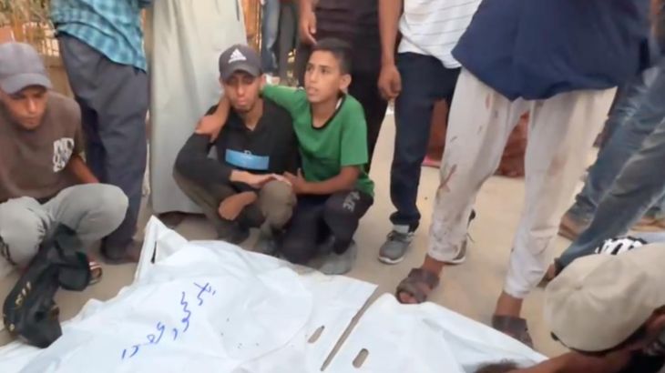 An attack on a school sheltering internally displaced Palestinians was hit by Israeli fire – killing at least 29 people. Survivors drove casualties, dead and alive, to Nasser Hospital in Khan Younis for treatment. One boy sitting outside the morgue said he’s the only member of his family left alive.