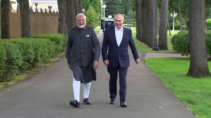President Vladimir Putin showed Indian Prime Minister Narendra Modi around his residence near Moscow during a two-day state visit. The leaders watched a horse-riding display featuring the two countries’ national flags.