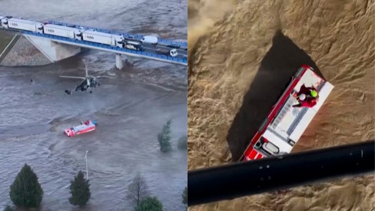 Video shows firefighters being rescued by helicopter from the roof of their fire truck after it was submerged by floodwater in the Czech Republic. The crew had been sent to help people affected by the flooding when they got stranded themselves.