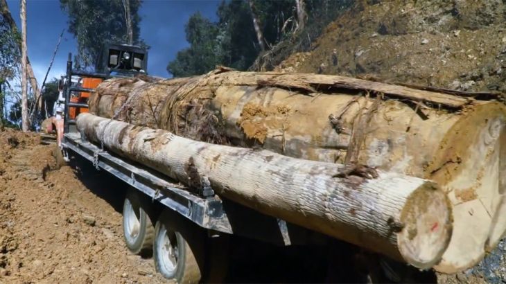 Loggers in Borneo struggle to transport giant wood logs on treacherous narrow forest trails and dangerous rivers.