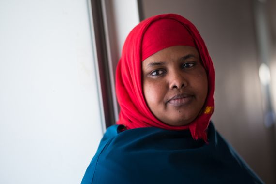 She wears traditional Somali dress – a long stretch of cloth across her body and a red scarf draped neatly over her head.